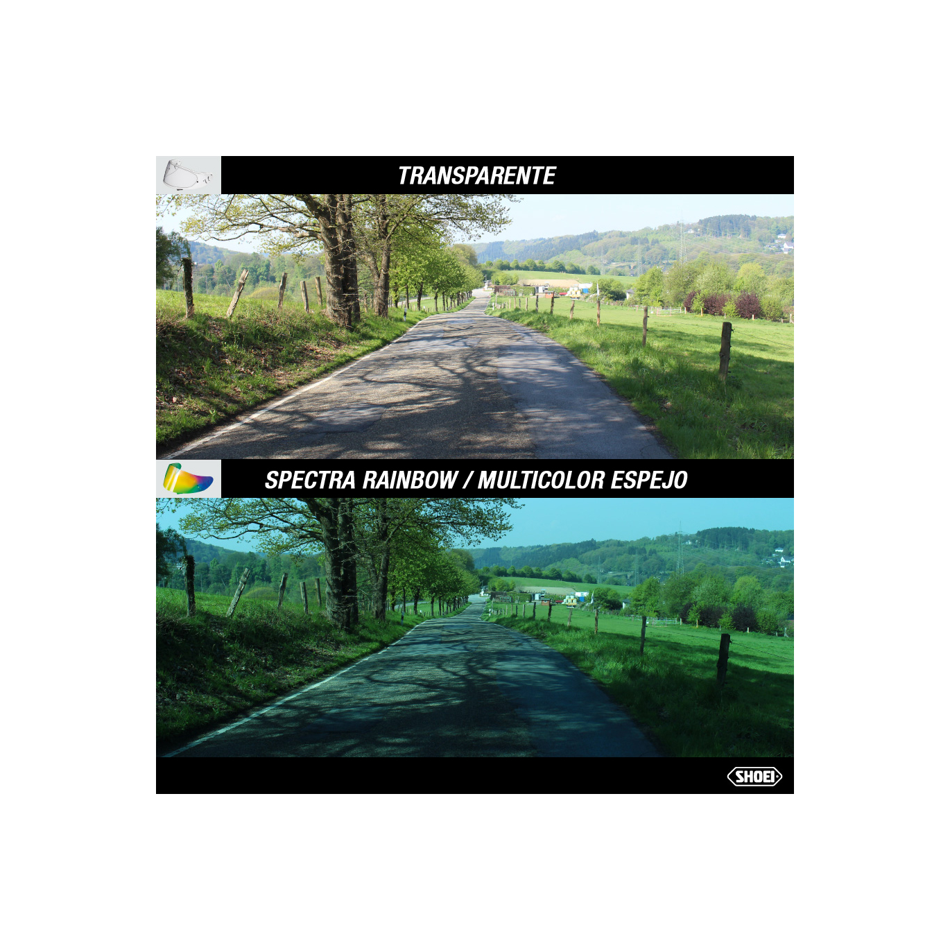 Con la pantalla “Spectra Fire” para cascos de moto SHOEI, la visión es casi la misma que con la “Spectra Gold”. Sin embargo, la visión desde el interior es casi la misma que con el modelo "Spectra Gold". Sin embargo, la impresión visual es bastante azulada-verdosa y por lo tanto ligeramente más cálida que con la pantalla “Spectra Gold”.