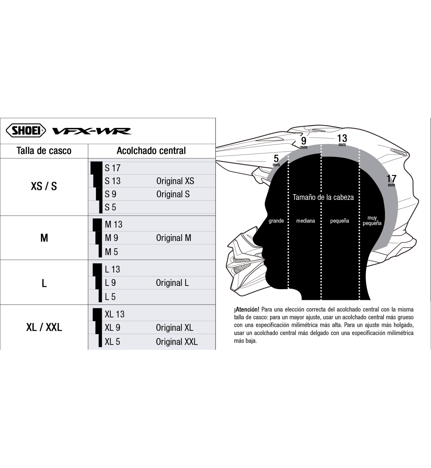 Se pueden utilizar acolchados centrales de diferentes tallas para personalizar el ajuste del casco en el área superior de la cabeza. Los acolchados para un modelo de casco son intercambiables dentro del alcance de su asignación de tamaño de calota interna, por ejemplo, "M5" - "M9" - "M13". "M5" representa un acolchado más delgado y "M13" uno más grueso, como se puede ver en nuestro esquema de tallas.