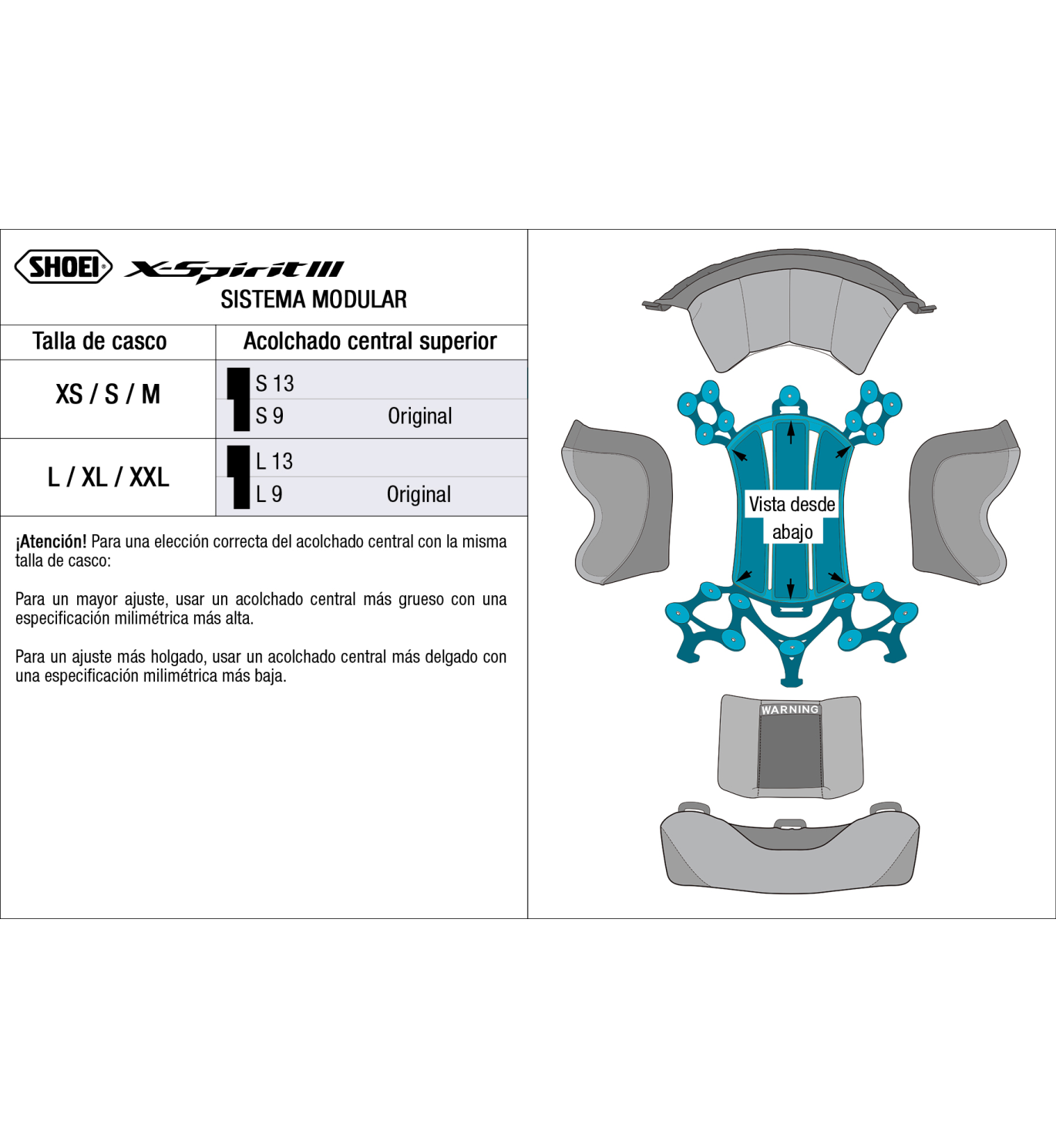 Puede encontrar la talla del acolchado original en la etiqueta que encontrará en la parte posterior de este. También puede saberlo mediante la talla de su casco de moto Shoei X-Spirit 3.